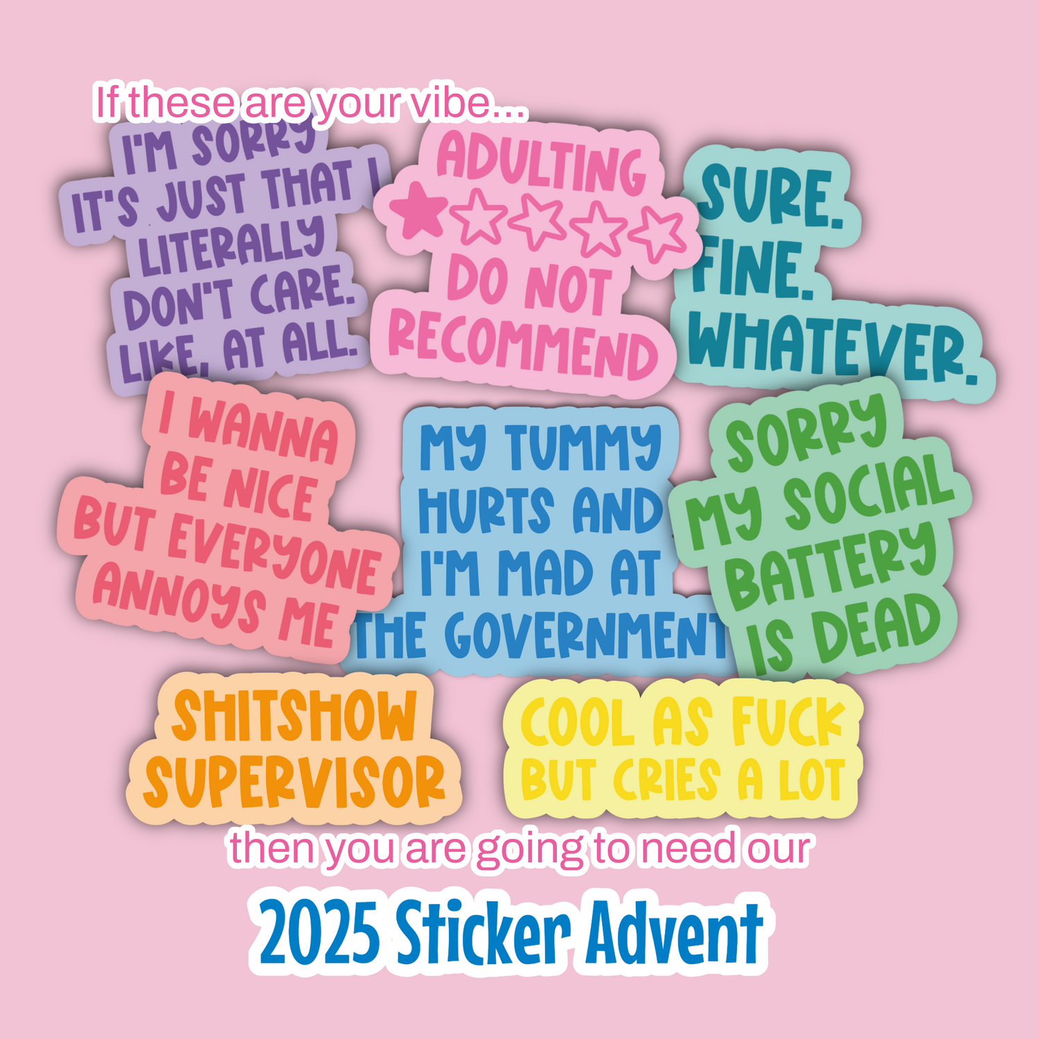In typical Linda fashion I was inspired last minute to make an advent full of sarky stickers to make you laugh in December.
