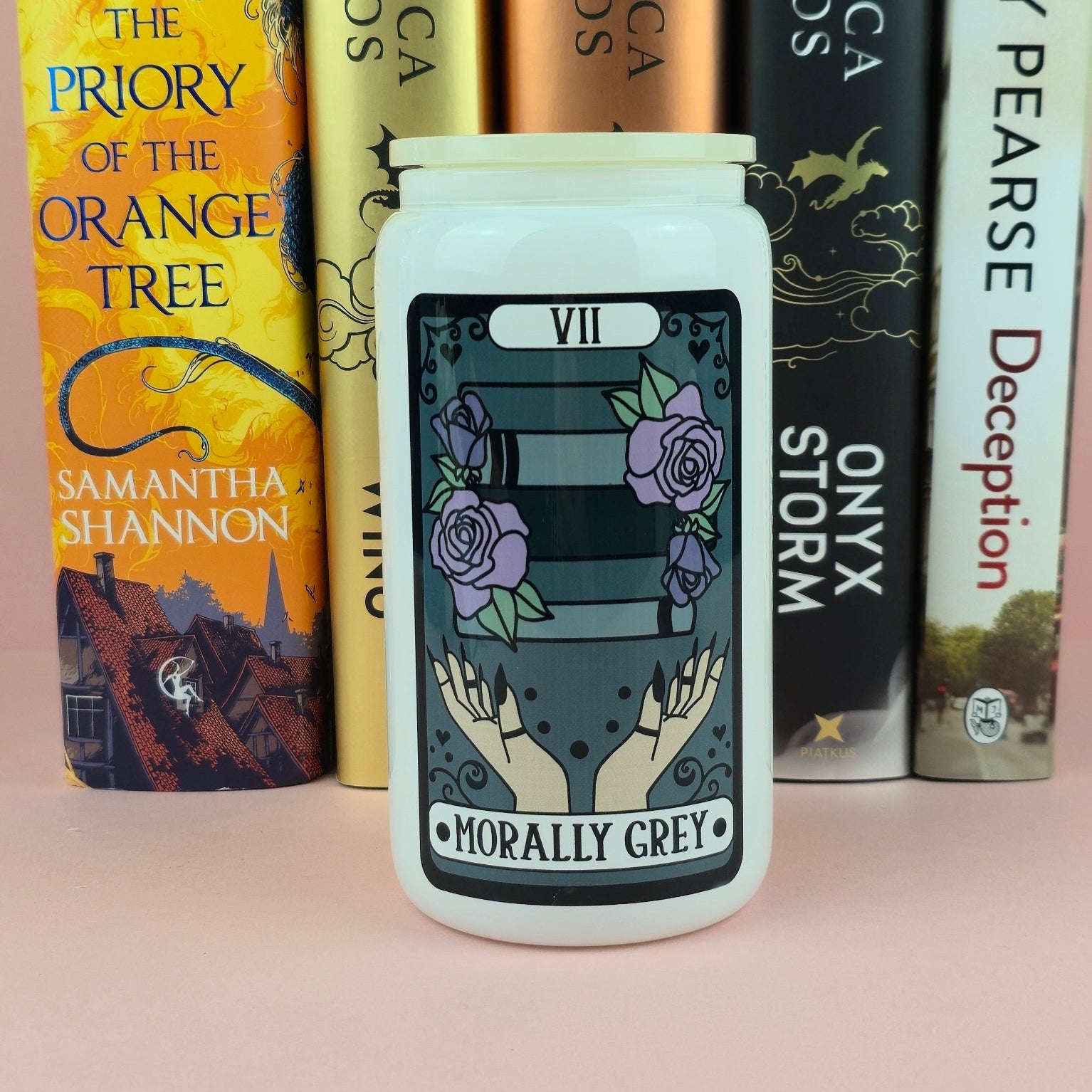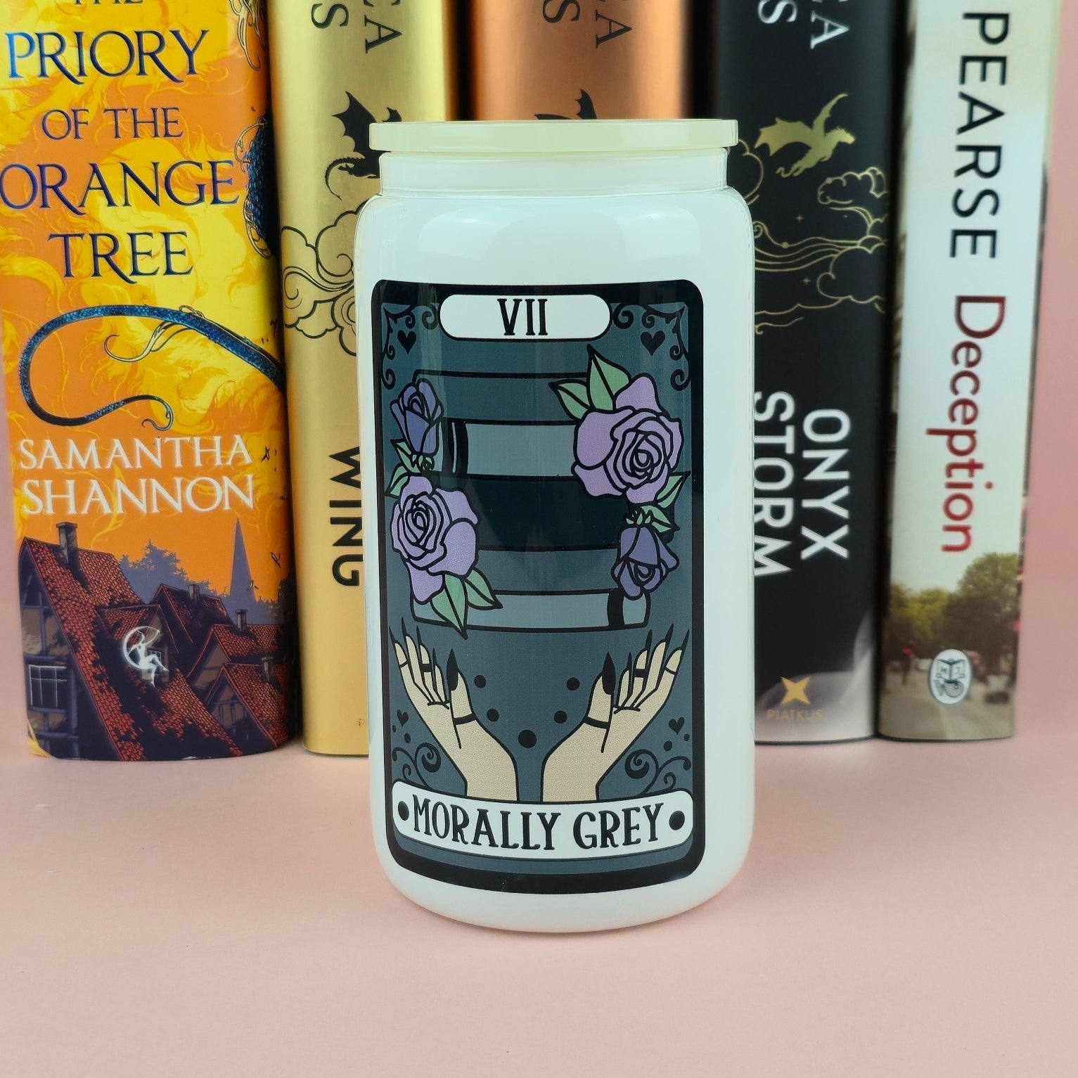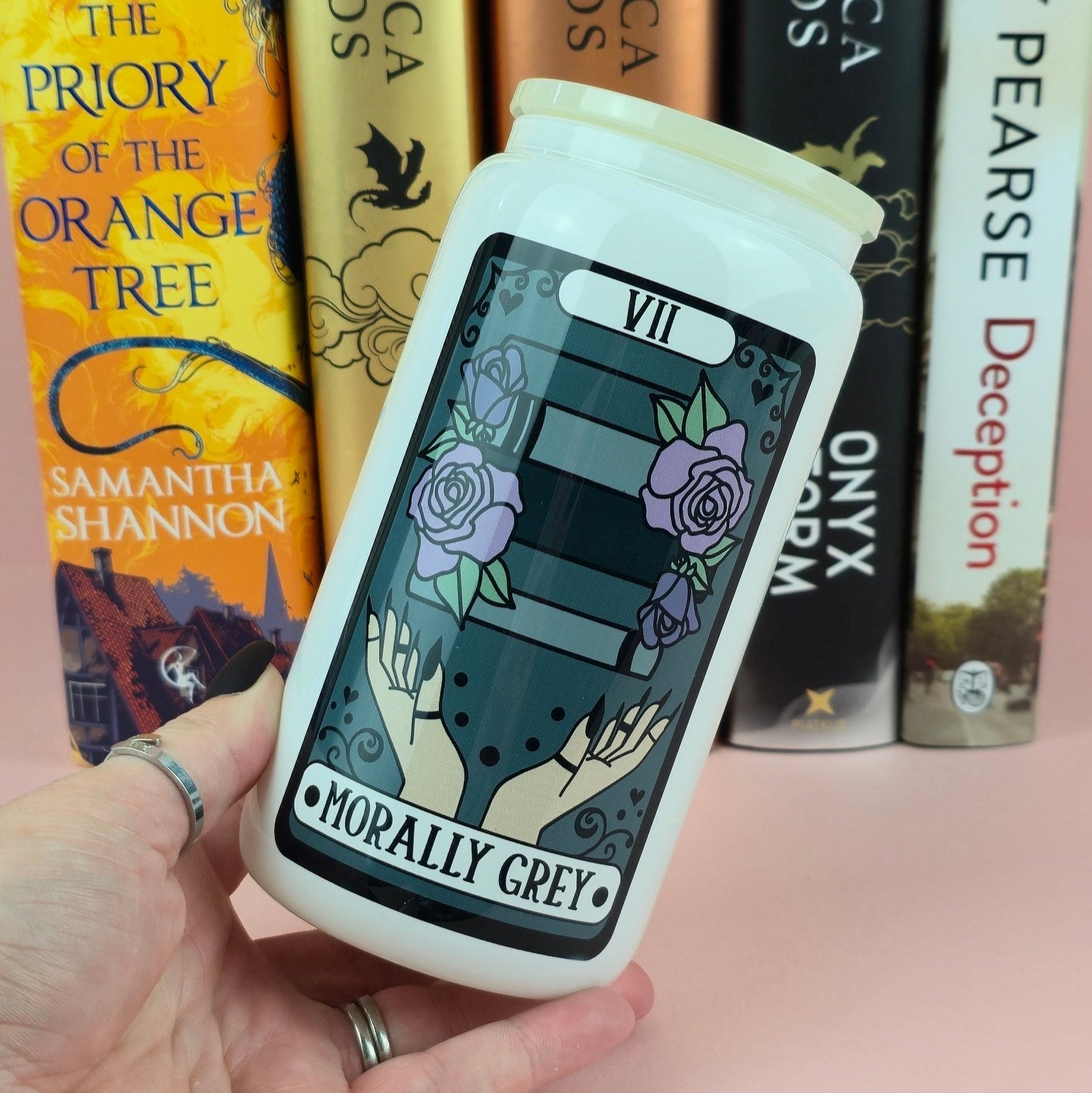 Glass Can - Morally Grey Tarot White Glass Tumbler - Bookish Gift - Reader