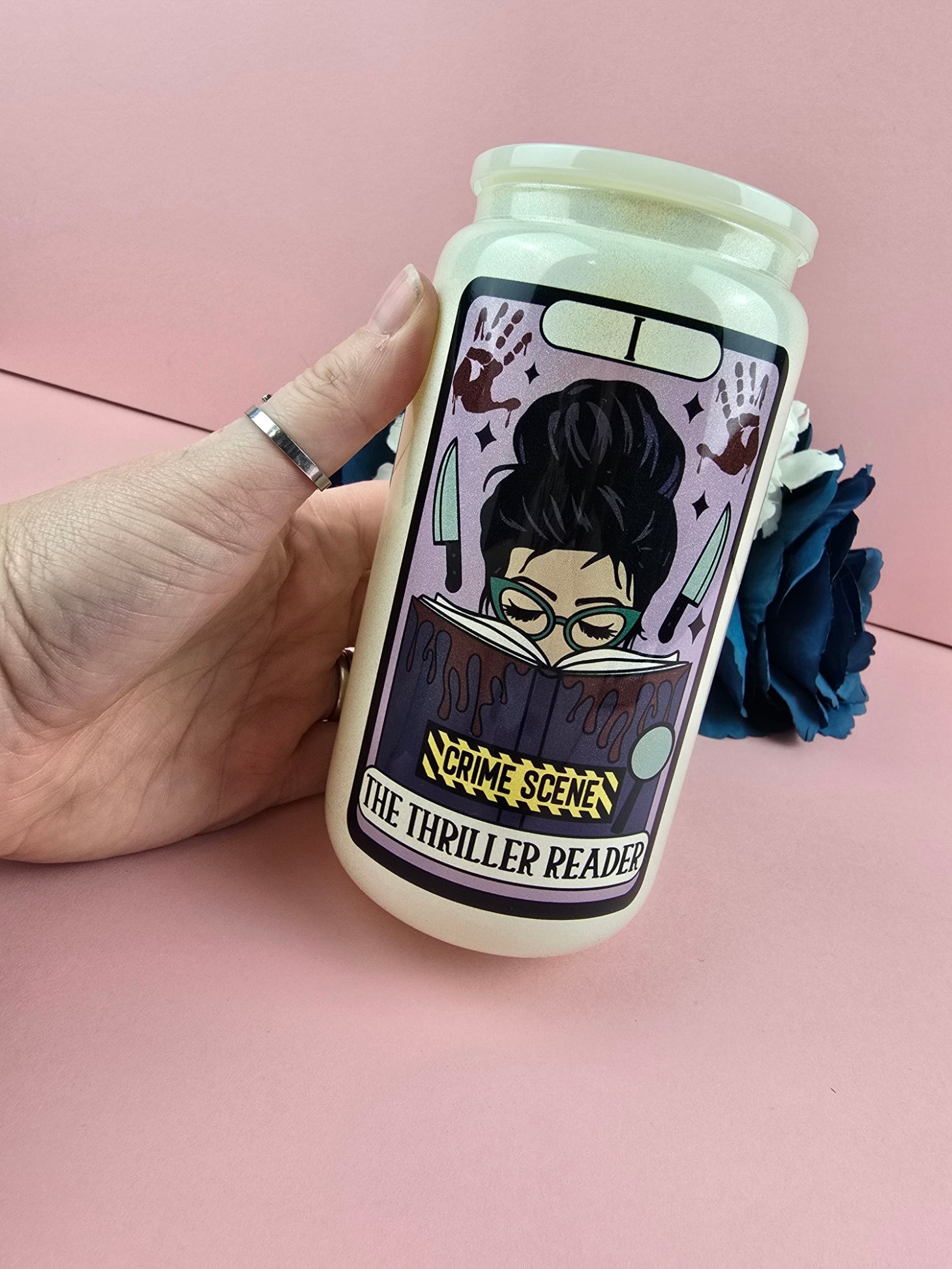 Glass Can - The Thriller Reader GLITTER Glass Tumbler - Bookish Gift - Reader