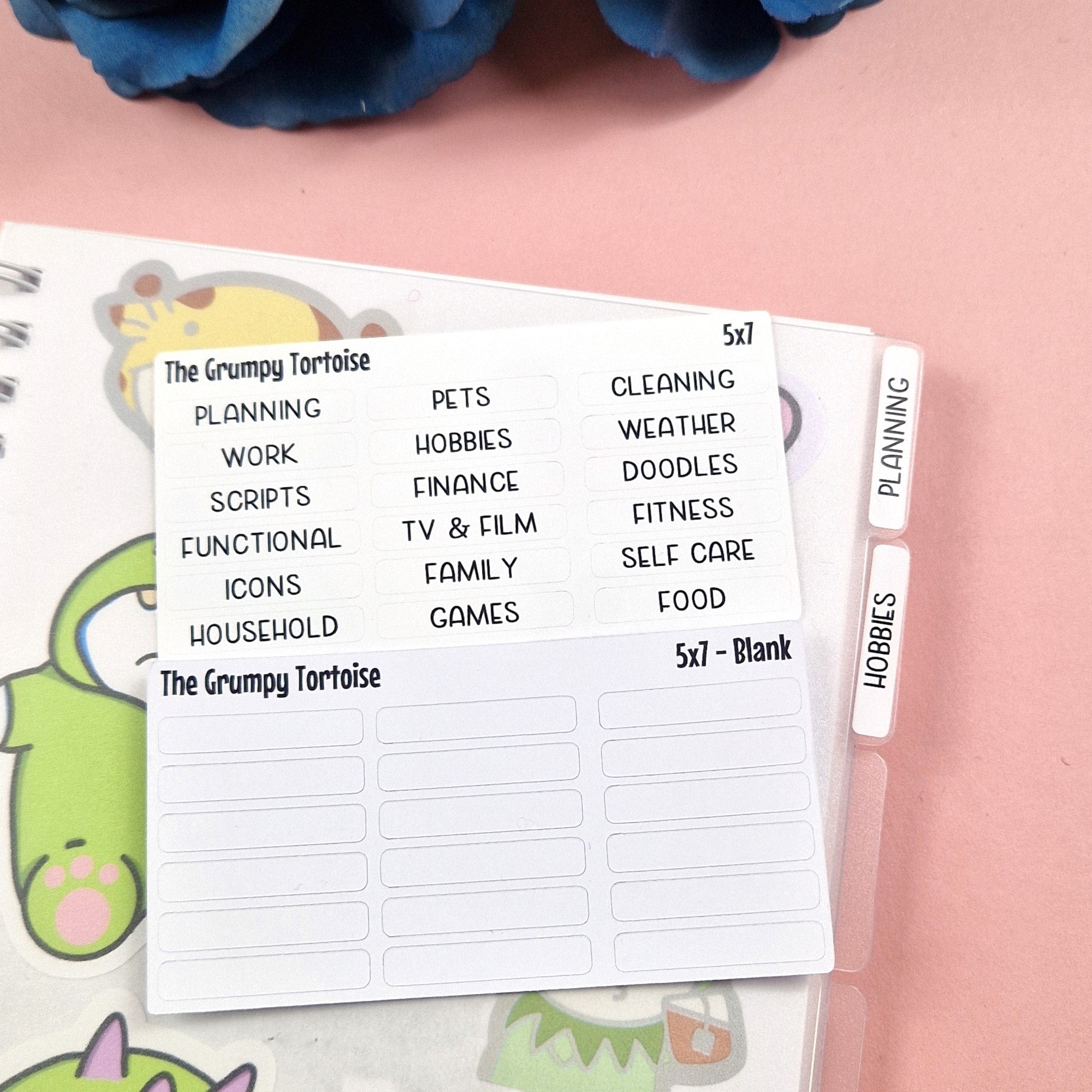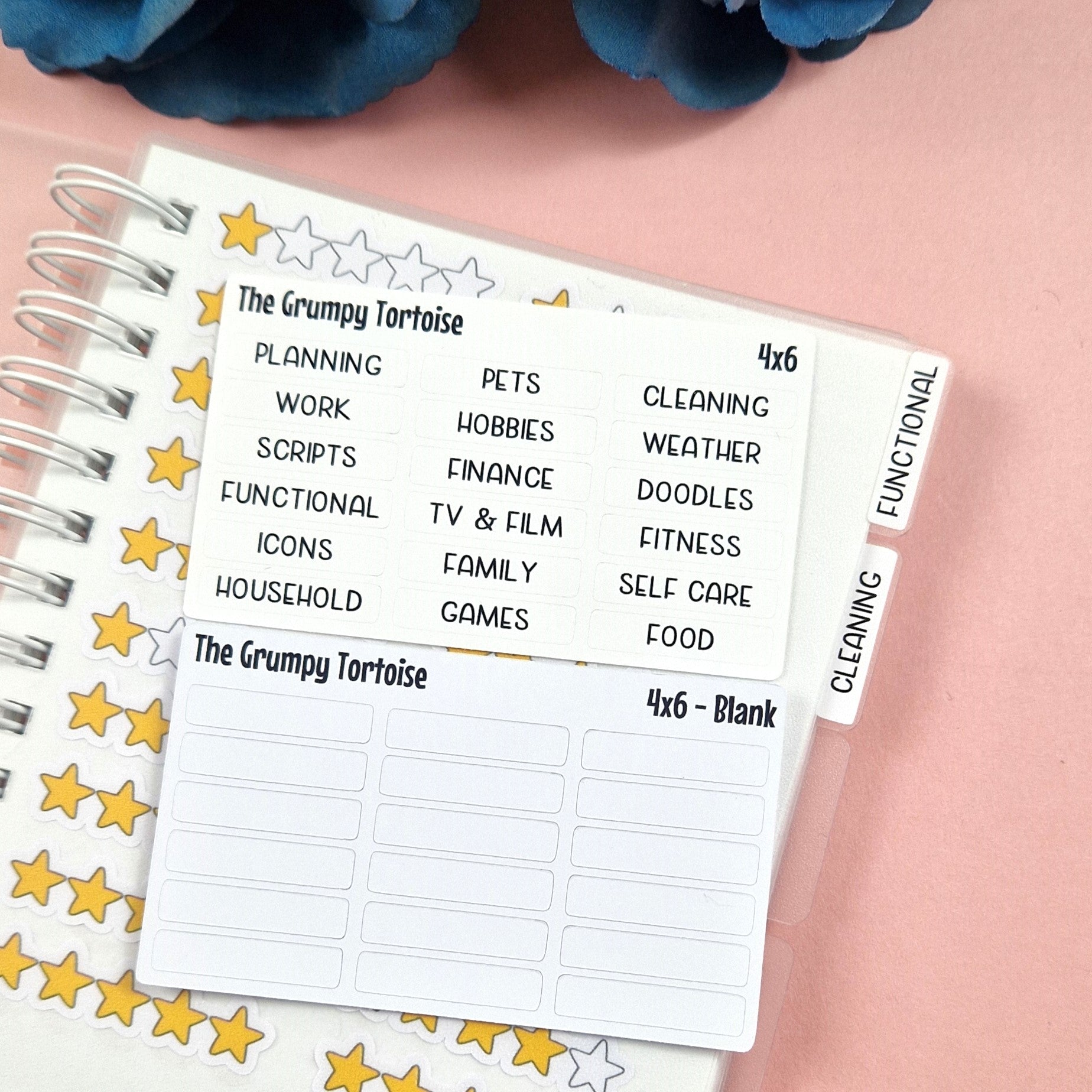 This listing is for 6 tabbed dividers to add to your reusable sticker book, if you're anything like me I love sticker books but struggle with the fact I can't organise the stickers in an easy way. These dividers are the answer! Each set now come with tab labels, one printed glossy waterproof set in popular words and a blank set for you to customise.