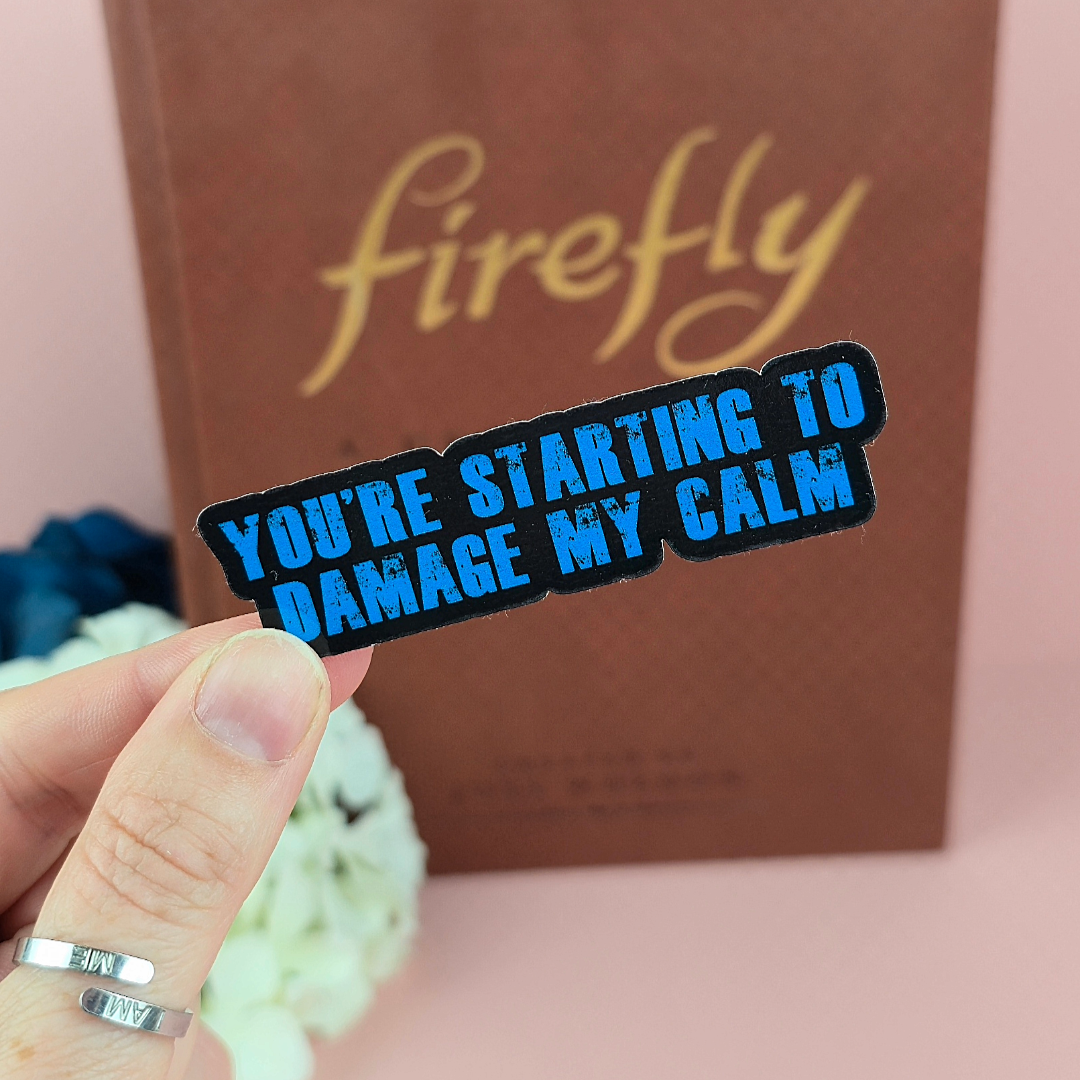 Keep your cool... or don’t. This “You’re Starting to Damage My Calm” sticker is a must-have for anyone who’s been this close to losing it – but doing so with style. Inspired by one of the most iconic lines from Firefly, it’s ideal for laptops, journals, water bottles, or anywhere that needs a warning label with a little fandom flair.
